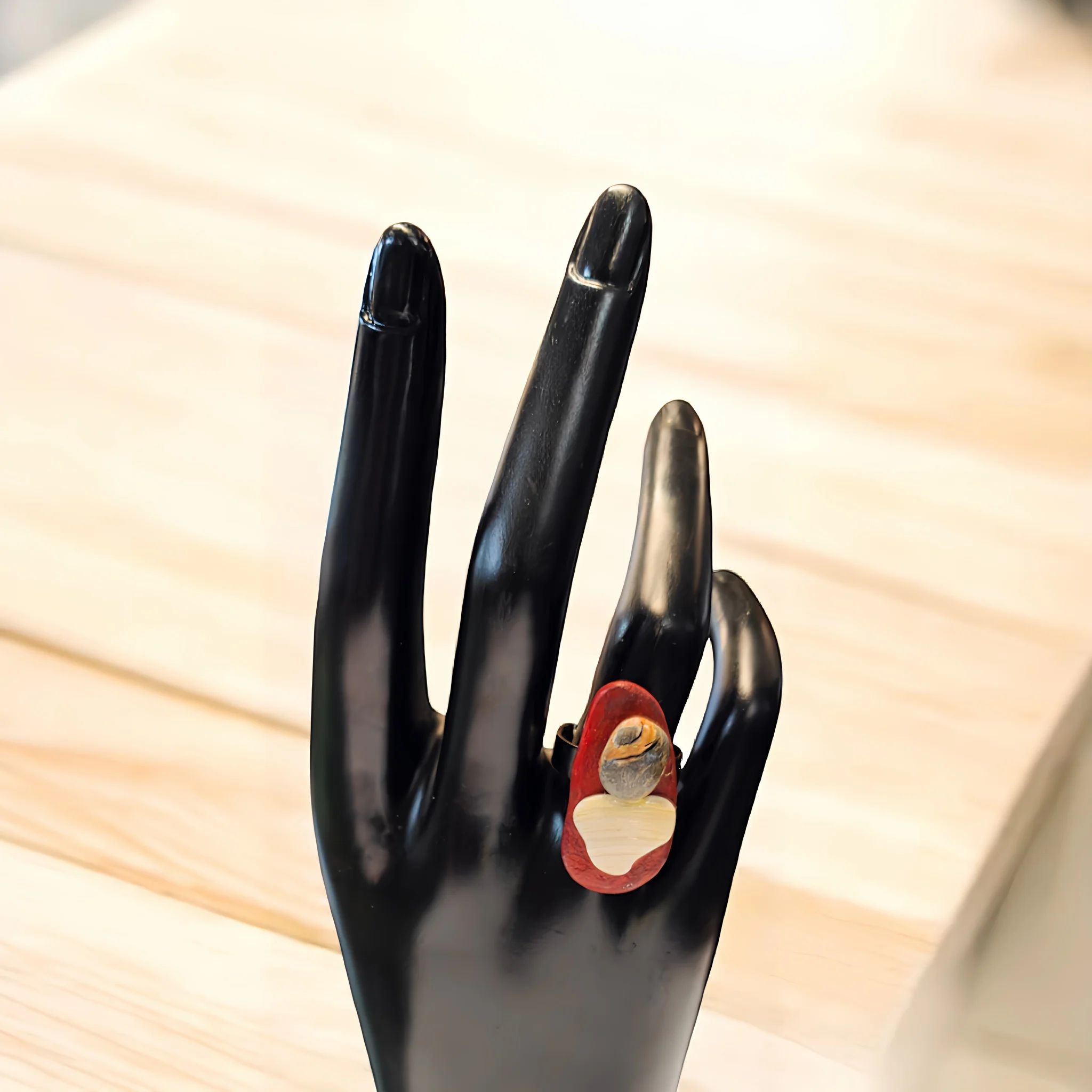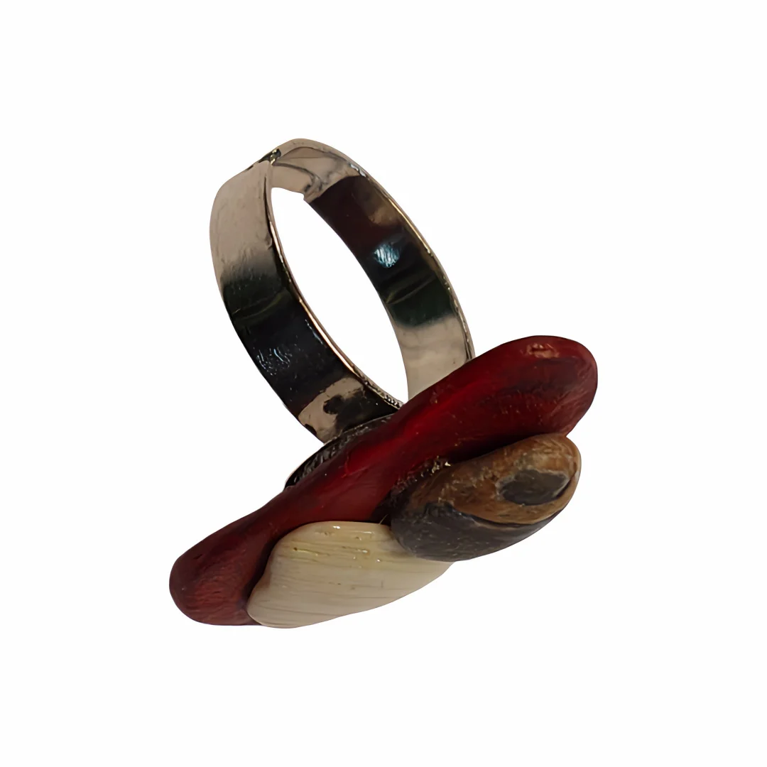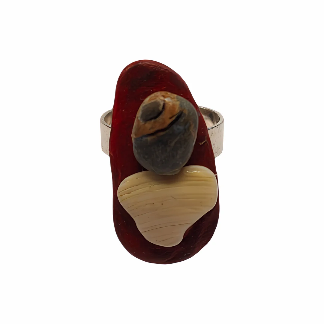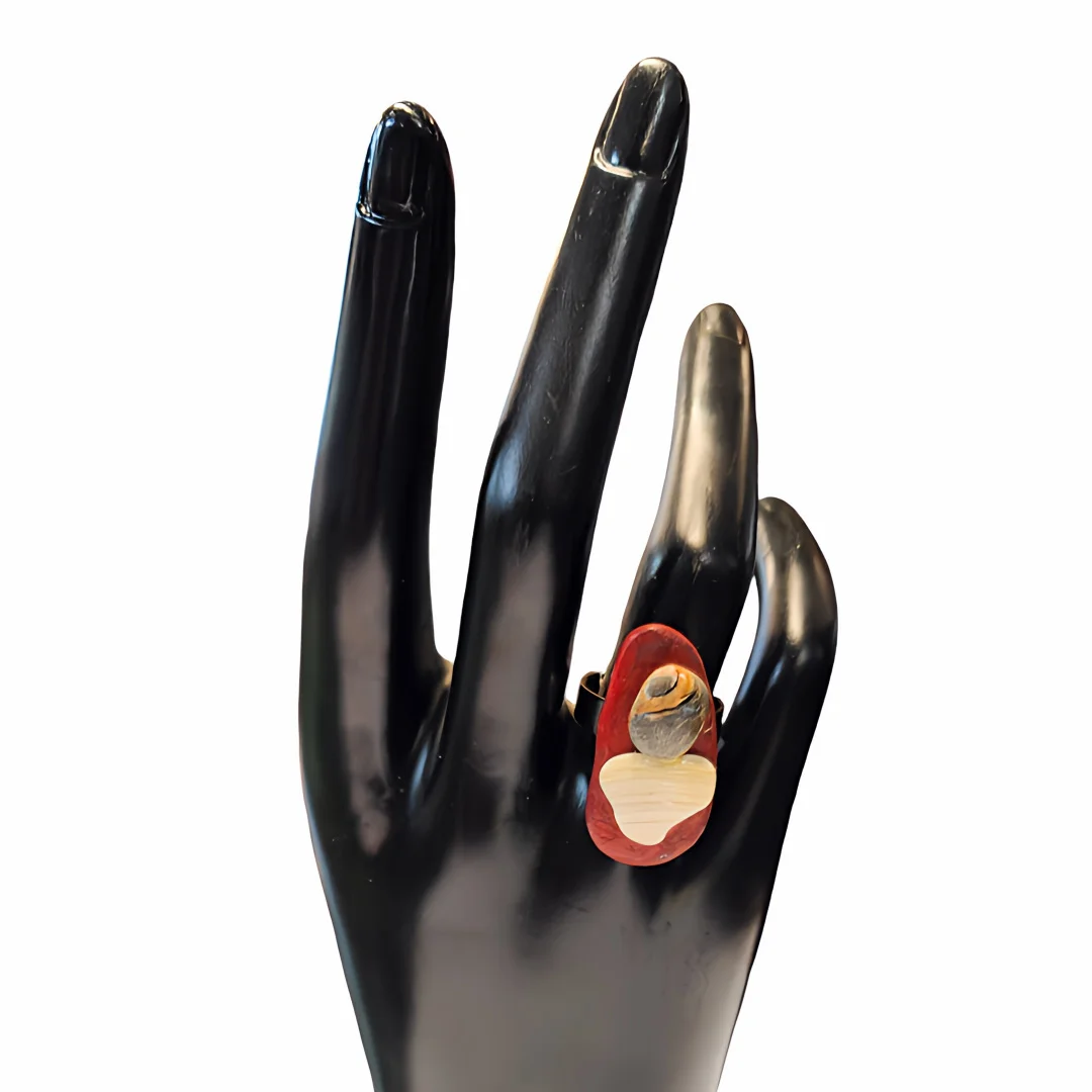 Anillo hecho a mano, montura de metal plateado. Confeccionados con piedras y trozo de concha natural pintado a mano.