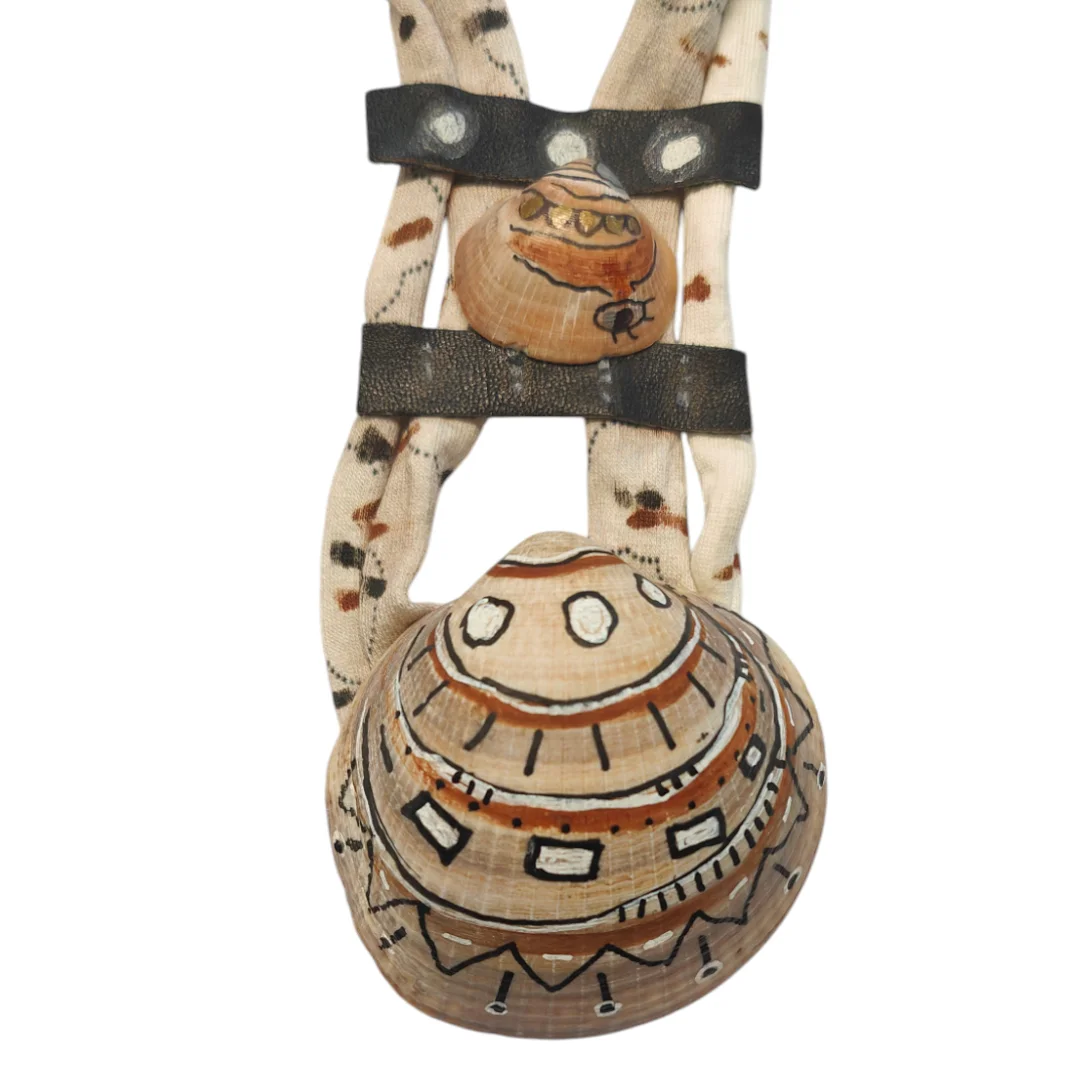 Collar hecho a mano con dos tiras de cordón de telas pintadas a mano que le dan un toque vibrante y fresco. Además, lleva detalles de conchas naturales del mar y trozos de cuero también pintados a mano. ¡Cada pieza cuenta su propia historia!.