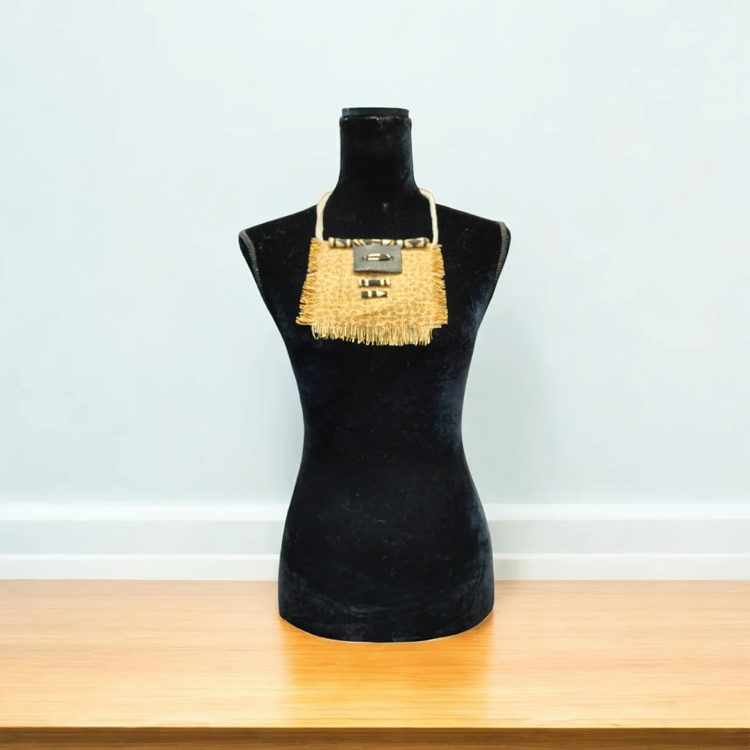 Collar artesanal, confeccionado con tela de trapillo, una pieza de rafia natural, telas étnicas y cuero. Este collar es único en su estilo y, lo mejor de todo, ¡es tan ligero que casi no lo sentirás al llevarlo puesto!.