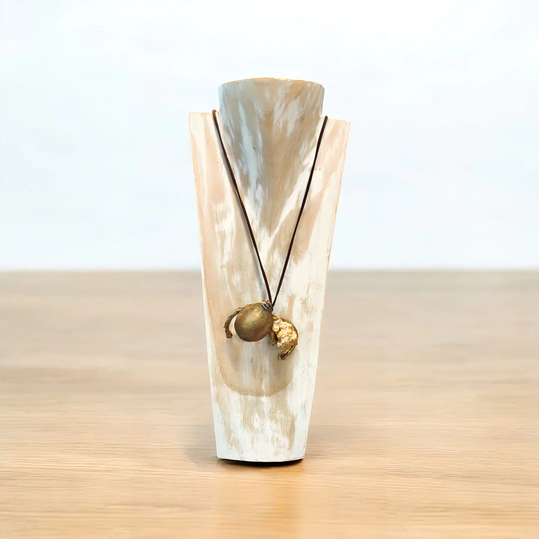 Collar confeccionado a mano con cordón de cuero en marrón y detalles de jacaranda (vaina natural de árbol) y piedra tipo rodolito, pintadas ambas en color dorado.