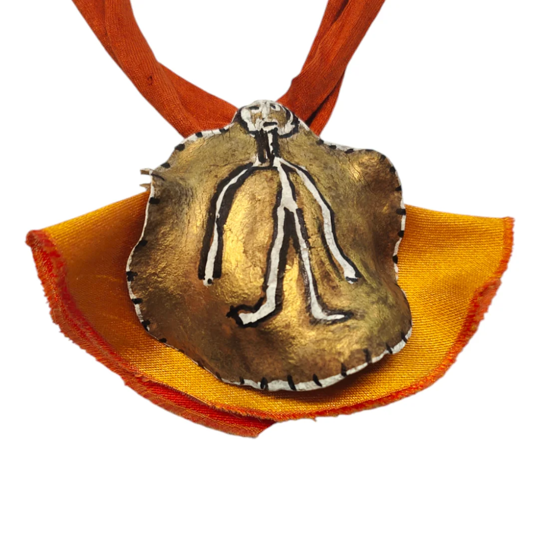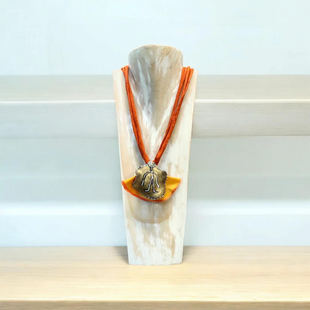 Collar artesanal hecho a mano con tiras de cordón de hilo y detalle de jacaranda (vaina natural de árbol), pintada a mano con trozo de tela en amarillo y naranja.