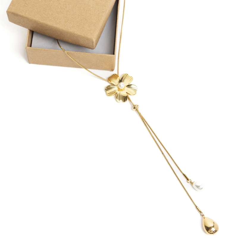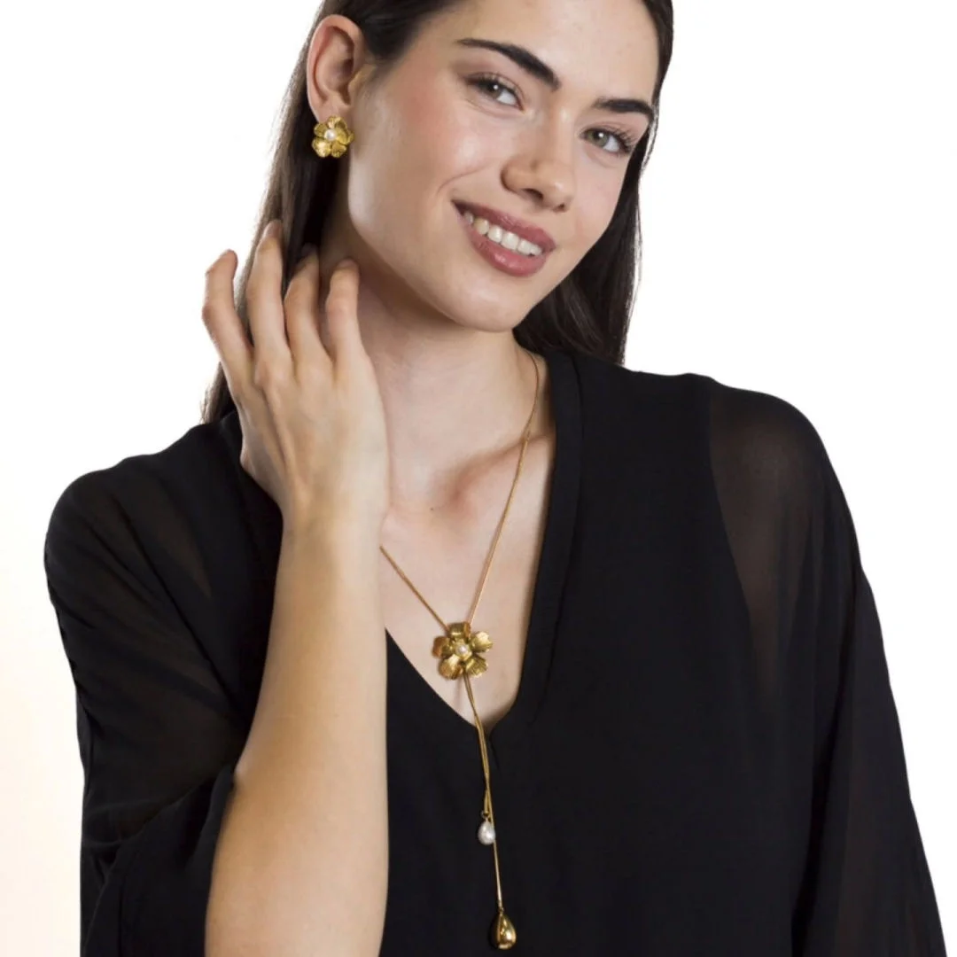 Collar en “Y” con cadena tipo “cordón”, que cuenta con un encantador colgante de flor grabado y una delicada mini perla en el centro. La terminación de doble cadena con un dije en forma de gota y perla de río lo hace aún más especial.