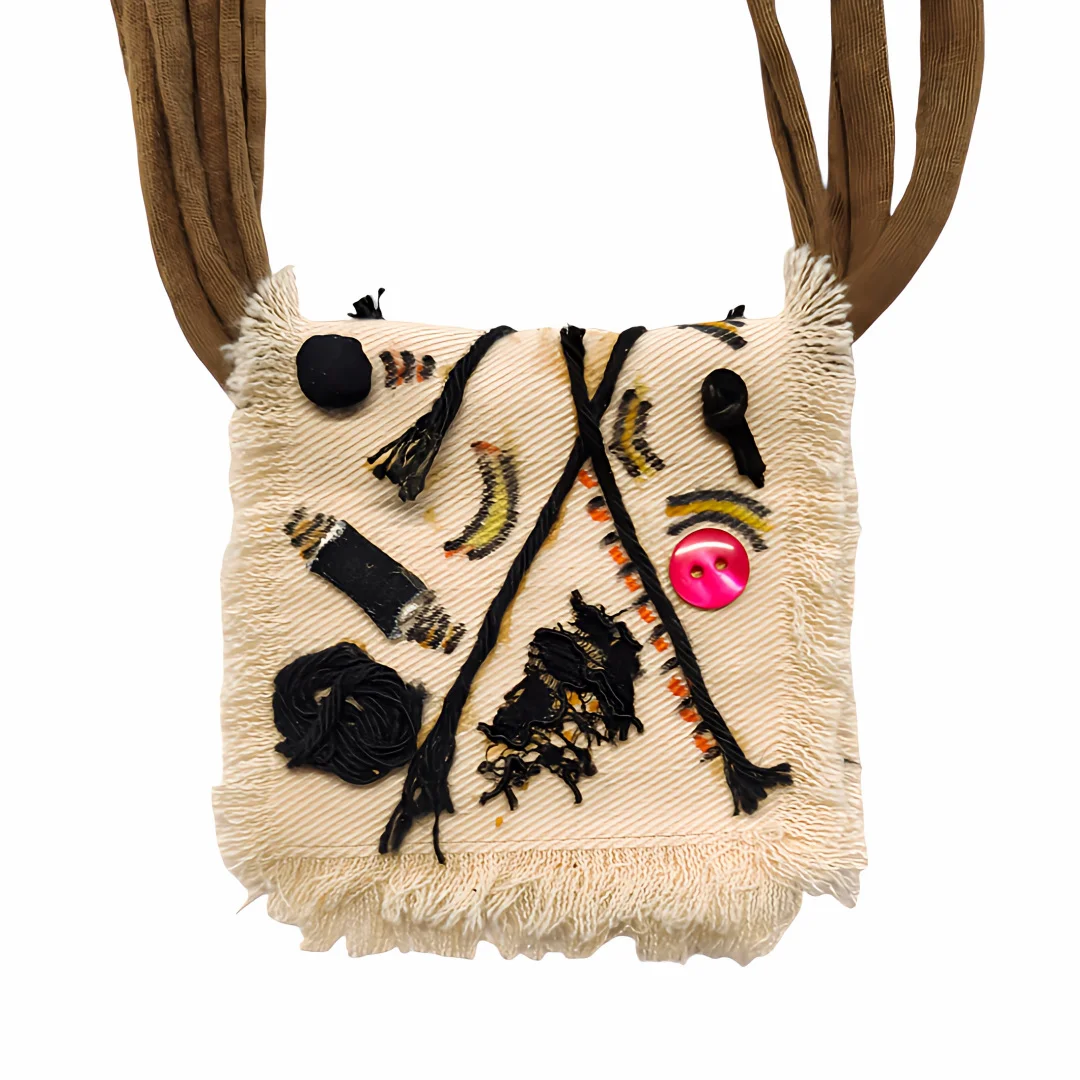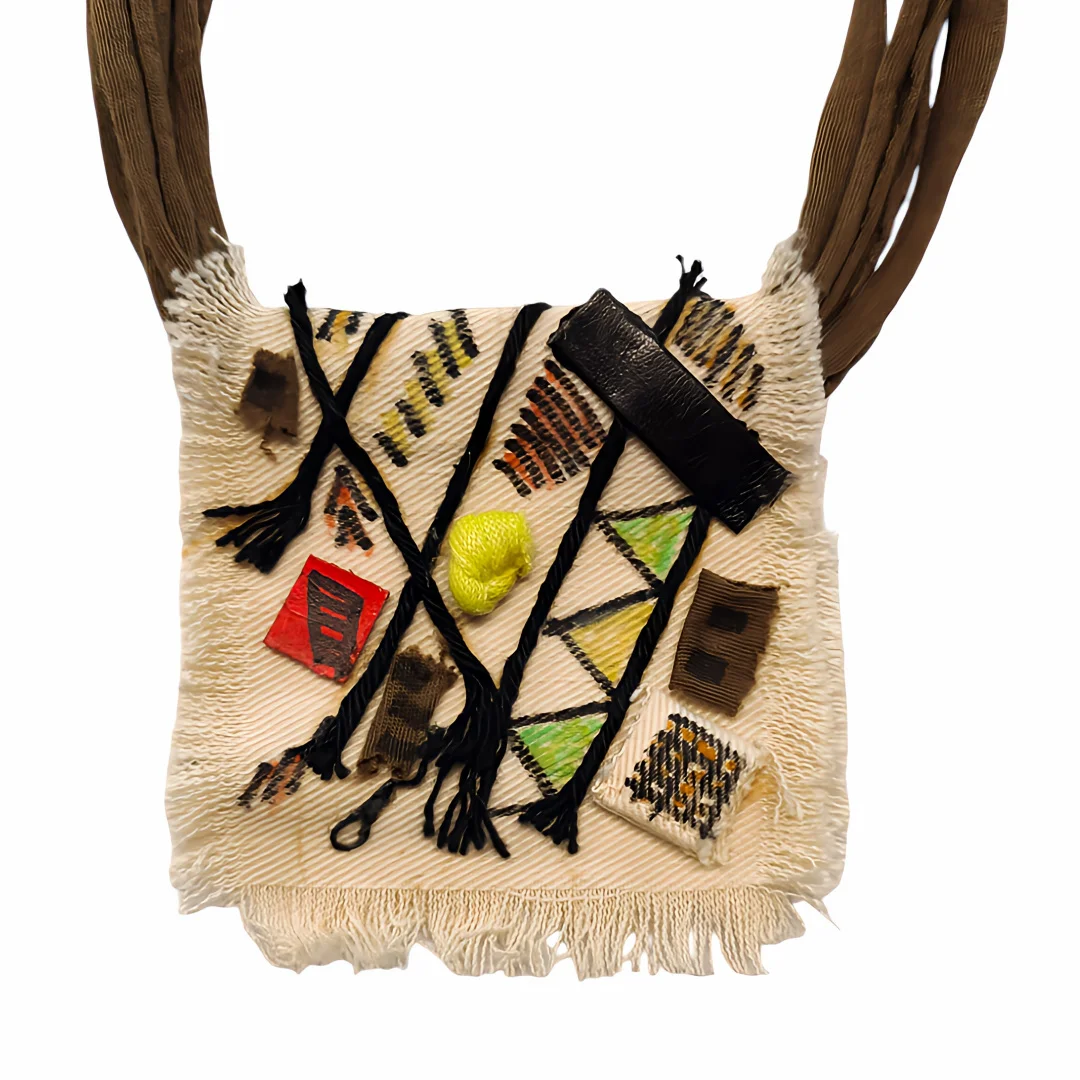 Collar artesanal estilo étnico, reversible y confeccionado con tiras de trapillo en tonos caqui y detalle central de tela cosida y pintada a mano, con abalorios, trocitos de tela y cuero.